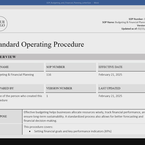 Take control of your business finances with this pre-drafted Budgeting & Financial Planning SOP Template. This comprehensive standard operating procedure provides a clear, structured approach to financial planning, ensuring your business stays on track with effective budgeting, expense management, and revenue forecasting. Use this SOP as-is or customize it to fit your organization’s unique requirements.