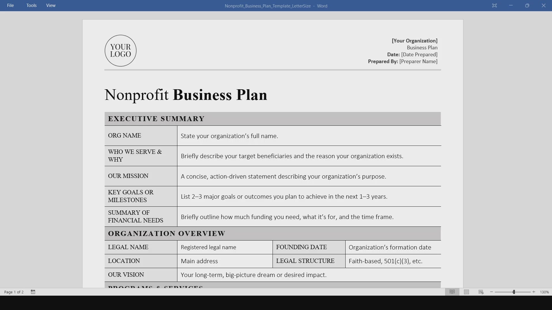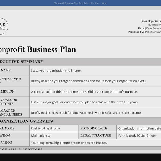 - Fully editable Nonprofit Business Plan Template in Microsoft Word (.docx)
