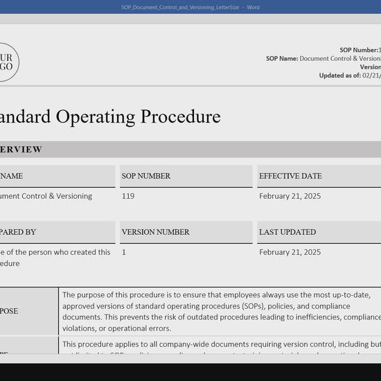 A well-defined Document Control & Versioning SOP helps prevent outdated procedures from being followed, reducing compliance risks and ensuring consistency in your operations.