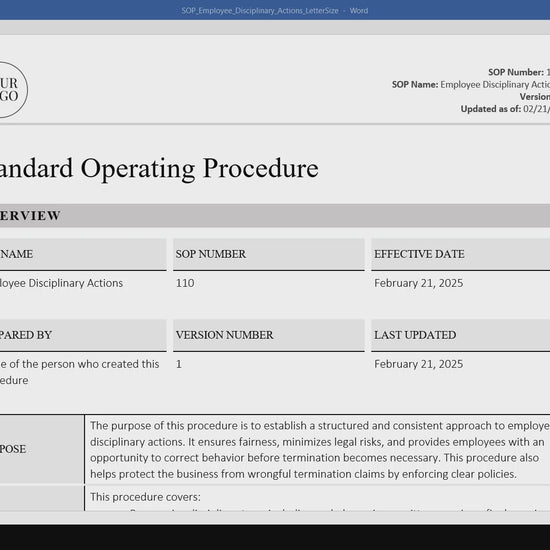Maintain fairness, legal compliance, and professionalism in your workplace with our Employee Disciplinary Actions SOP Template. This pre-drafted standard operating procedure provides a clear, structured process for handling employee misconduct and performance issues while protecting your business from legal risks. Use this SOP as-is or customize it to fit your organization’s unique requirements.