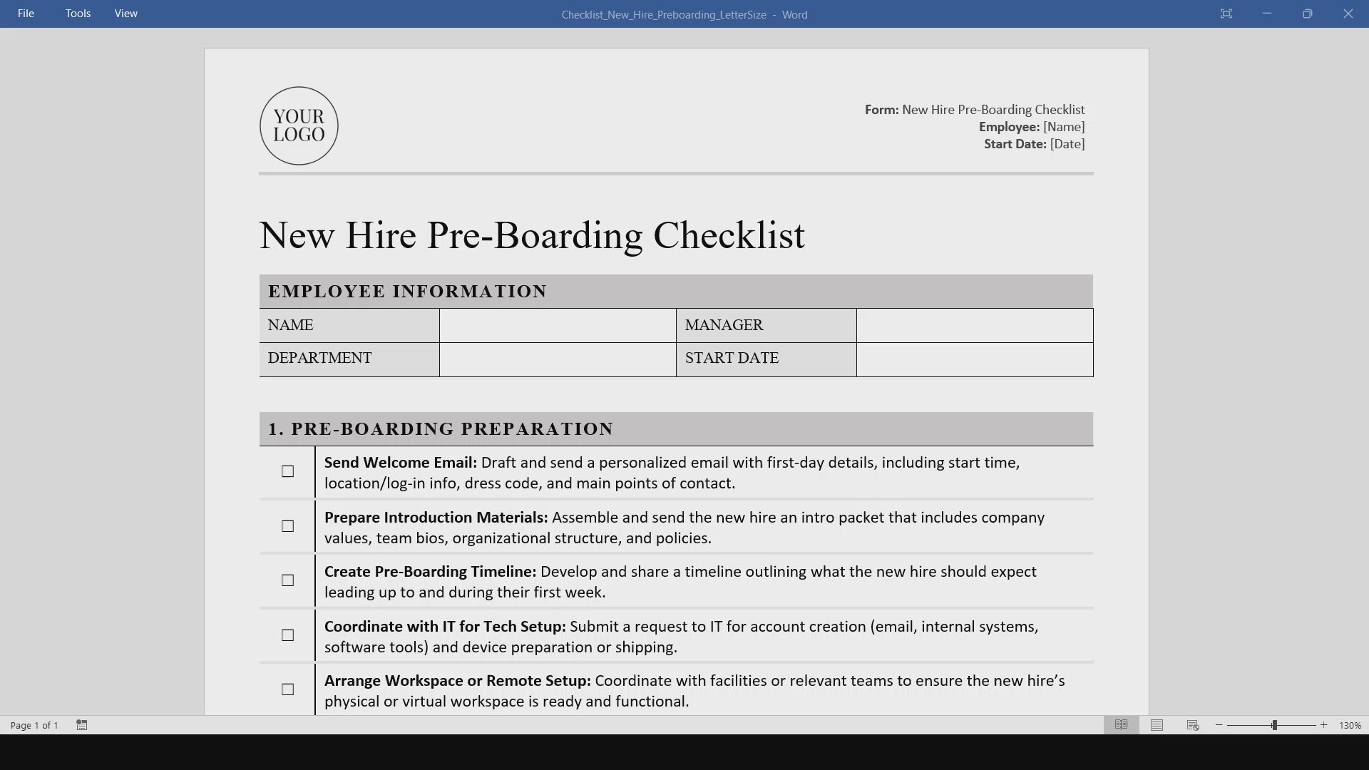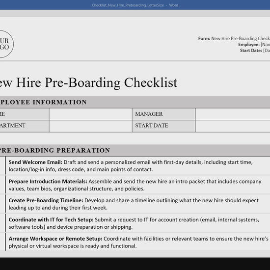 - Fully editable New Hire Pre-Boarding Checklist Template in Microsoft Word (.docx)