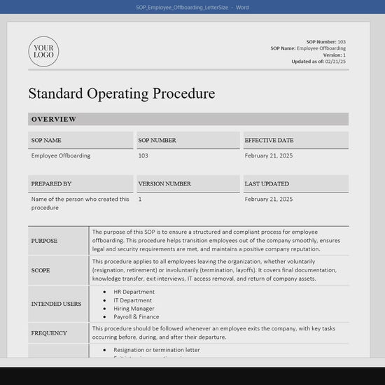 Streamline your employee offboarding process with our pre-drafted Employee Offboarding SOP Template. Designed for clarity and efficiency, this ready-to-use SOP template ensures every step of the offboarding process is handled smoothly, minimizing risks and maintaining compliance. Use this SOP as-is or customize it to fit your organization’s unique offboarding requirements.
