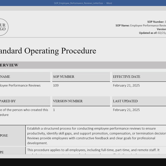 Ensure fair, structured, and productive employee evaluations with our Employee Performance Reviews SOP Template. This pre-drafted standard operating procedure provides a step-by-step framework for conducting consistent and effective performance reviews. Use it as-is or customize it to align with your company’s unique evaluation policies.