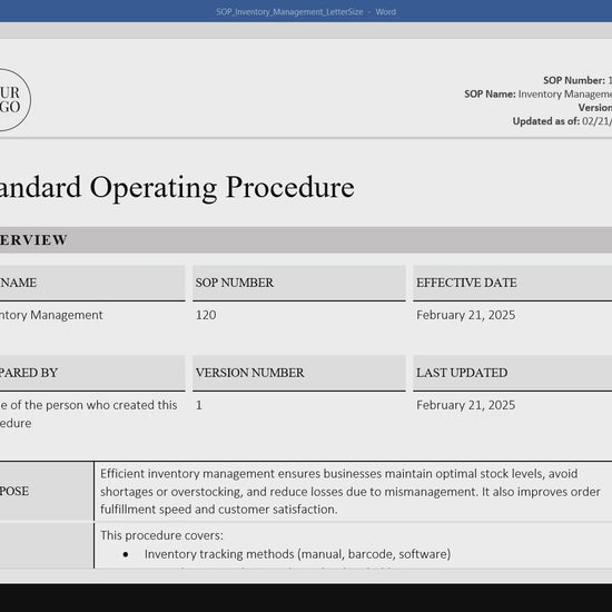 Efficient inventory management is crucial for maintaining optimal stock levels, improving order fulfillment, and reducing losses due to mismanagement. Our Inventory Management SOP Template provides a structured, step-by-step approach to tracking inventory, restocking procedures, supplier coordination, and auditing—helping businesses streamline operations and minimize discrepancies. Use this SOP as-is or customize it to fit your organization’s unique requirements.