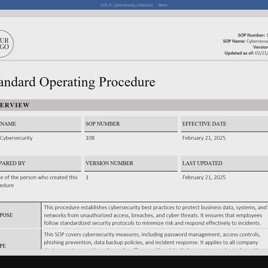 A strong cybersecurity SOP is essential for protecting sensitive data, preventing cyber threats, and ensuring your employees follow best practices. Keep your business secure with this comprehensive, ready-to-use template.