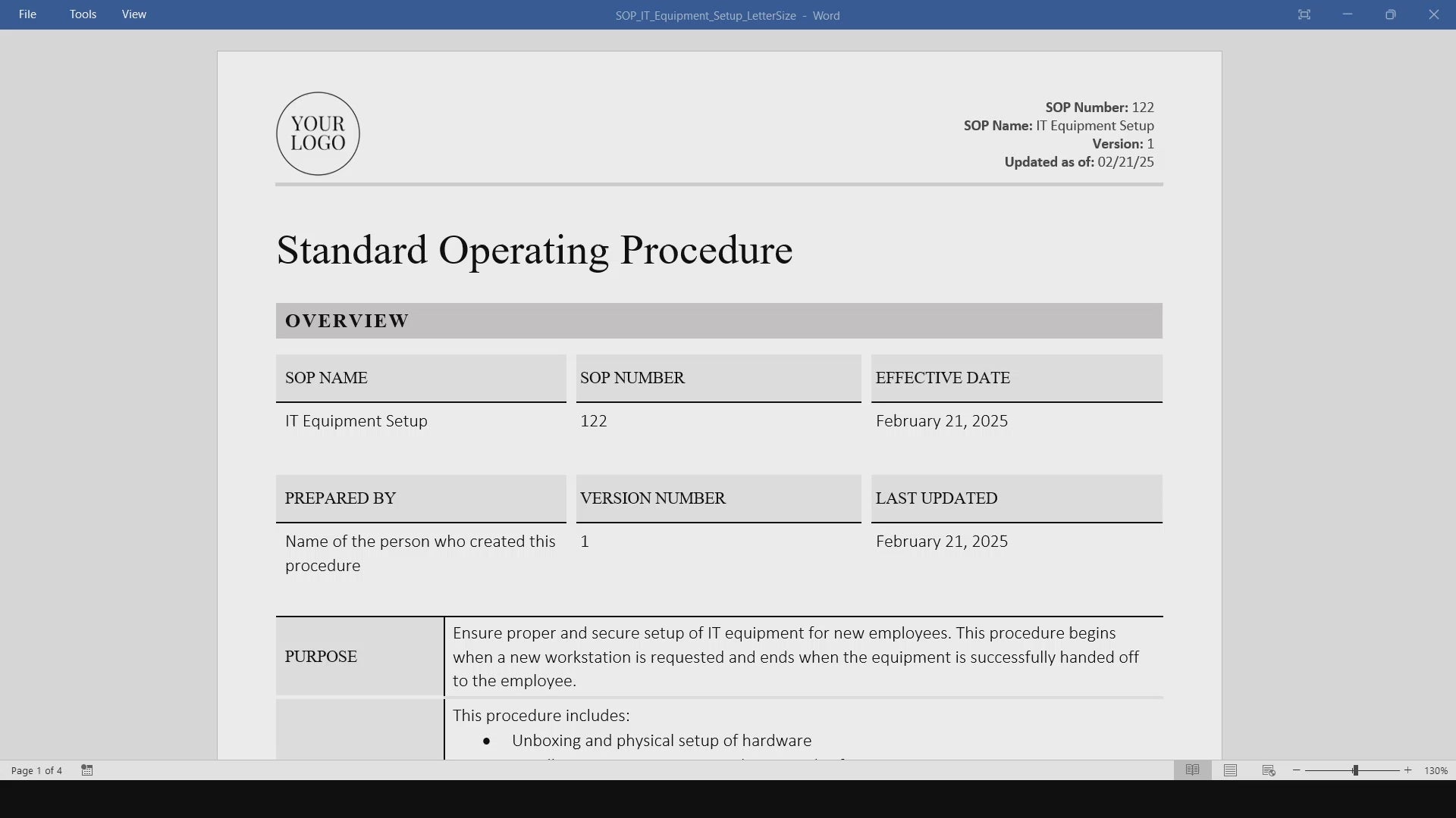 IT Equipment Setup SOP Template (Word & PDF) – Simple Standard Operating Procedure Template