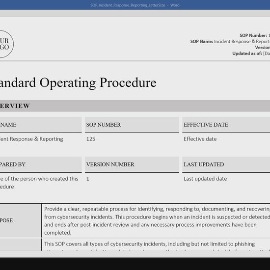 Stay calm under pressure and keep your organization protected with our Incident Response & Reporting SOP Template. This pre-drafted standard operating procedure gives your team a clear, repeatable framework for detecting, containing, and responding to cybersecurity incidents—minimizing damage, protecting sensitive data, and improving your overall security posture. Use this SOP as-is or customize it to fit your organization’s unique requirements.