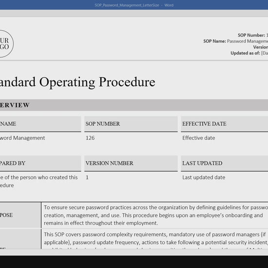 From enforcing strong password requirements and using password managers to implementing multi-factor authentication (MFA), this SOP walks your team through every critical aspect of password security. It outlines employee responsibilities, IT configurations, and incident response steps for compromised credentials.