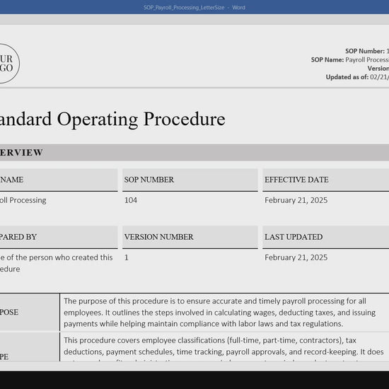 Ensure accurate and efficient payroll management with our Payroll Processing SOP Template. This pre-drafted standard operating procedure outlines every critical step, from employee classification to tax compliance, helping your business maintain accuracy, consistency, and legal compliance. Use it as-is or customize it to fit your company's payroll policies and procedures.