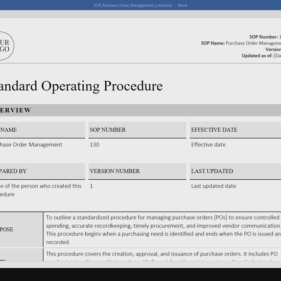 Looking to streamline your purchasing process and avoid costly errors? This Purchase Order Management SOP Template is the perfect plug-and-play solution for small business owners, operations managers, and procurement teams who need a clear, professional, and editable document to guide their PO procedures. Use this SOP as-is or customize it to fit your organization’s unique requirements.