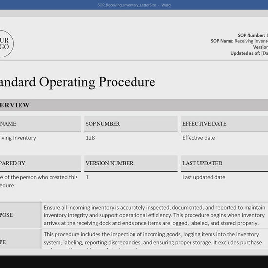 Efficient receiving procedures are the first line of defense in maintaining accurate inventory and ensuring smooth warehouse operations. Our Receiving Inventory SOP Template provides a clear, step-by-step process for inspecting shipments, logging items, reporting discrepancies, and properly labeling and storing stock. Use this SOP as-is or customize it to fit your organization’s unique requirements.