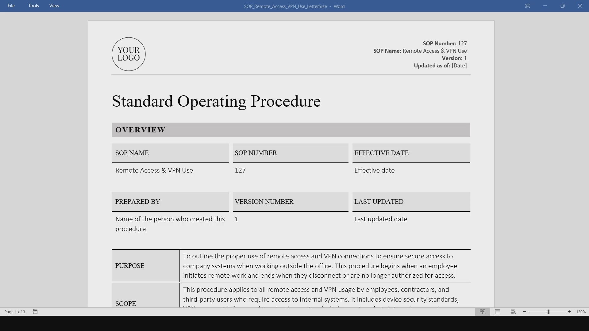 Remote Access & VPN Use SOP Template (Word & PDF) – Simple Standard Operating Procedure Template