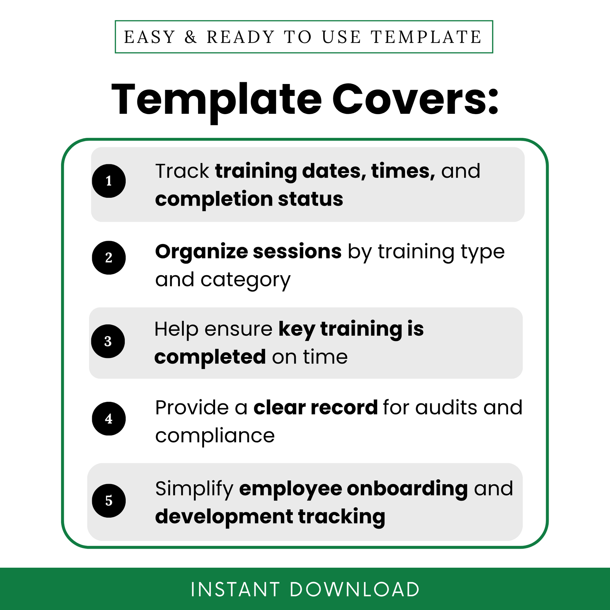 Whether you're preparing for audits, onboarding new hires, or simply keeping your team’s skills current, this pre-formatted spreadsheet makes it simple to record, manage, and stay on top of training requirements across departments.