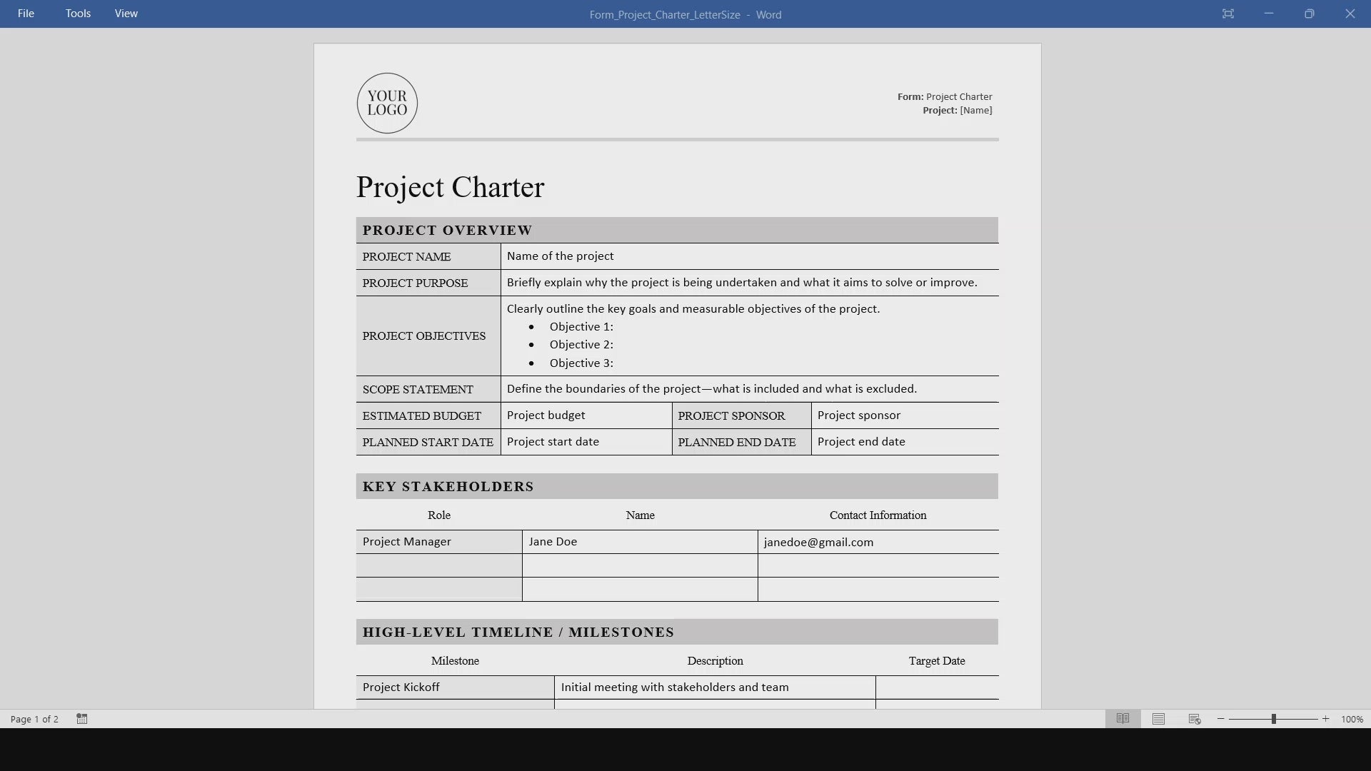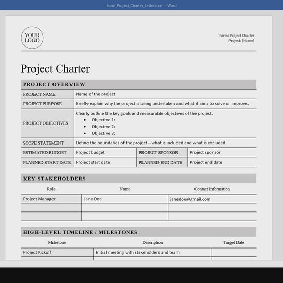 - Fully editable Project Charter Template in Microsoft Word (.docx)