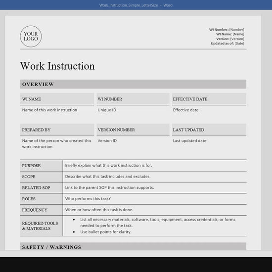 - Fully editable Work Instruction Template in Microsoft Word (.docx)
