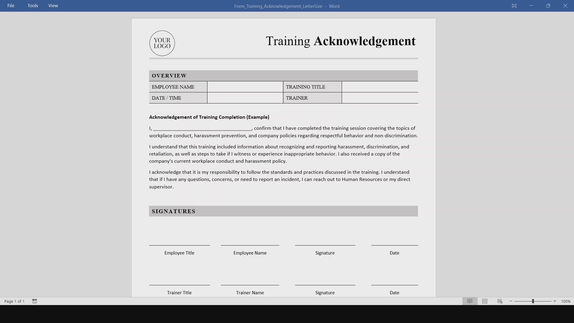 - Fully editable Training Acknowledgement Form Template in Microsoft Word (.docx)